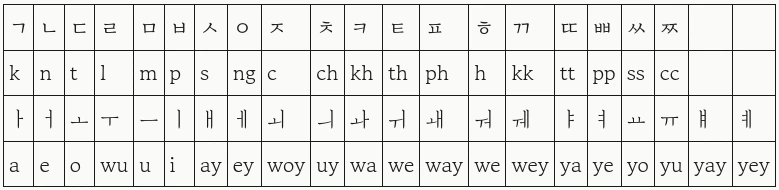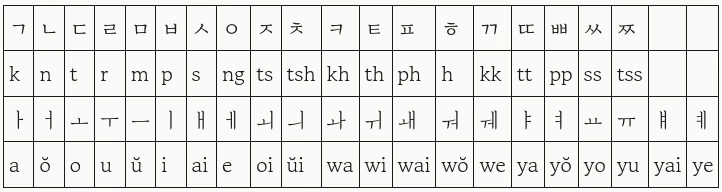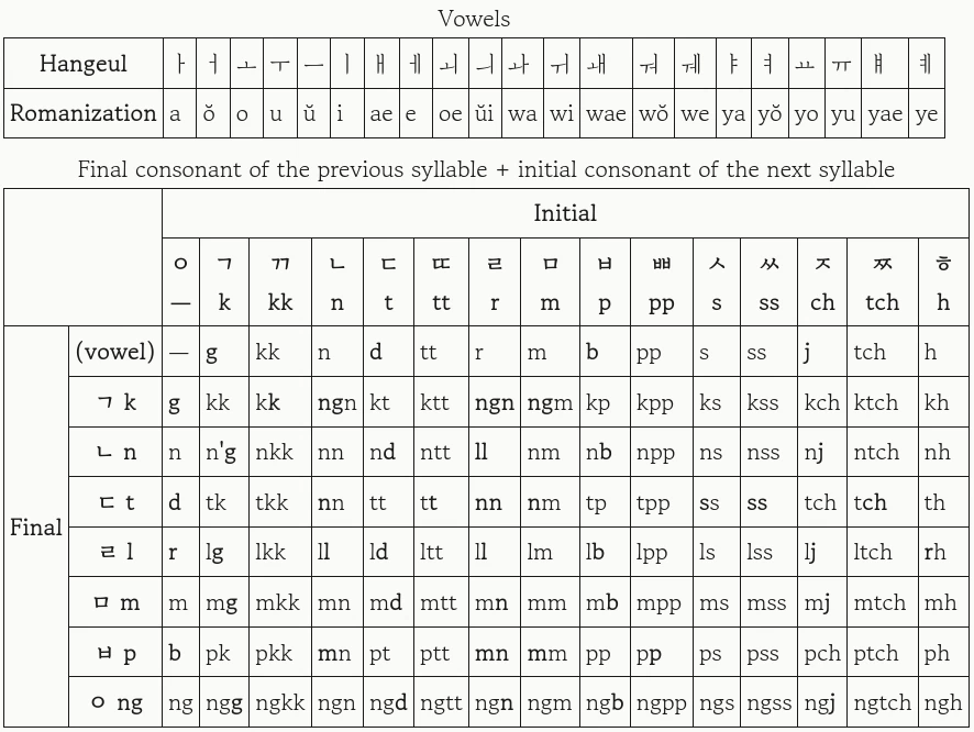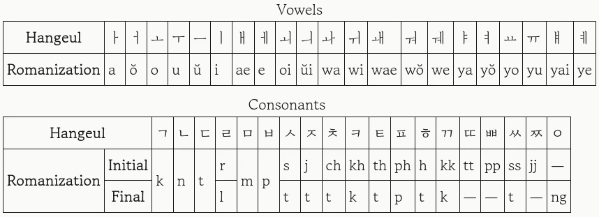 What follows is a simplified table showcasing the McCune-Reischauer system. There are cases and irregularities not covered by the table below. The full system can be viewed in the following wikipedia entry on the McCune–Reischauer system or sections "II. THE VOWELS" and "III. THE CONSONANTS" in "The Romanization of the Korean Language Based on Its Phonetic Structure".